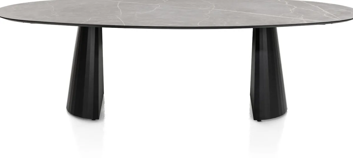 Lekker lang tafelen wordt nóg gezelliger aan deze ellipsvormige eetkamertafel ARABAX uit de collectie van XOOON! Zie jij jezelf al zitten aan deze moderne musthave met speelse vormen? De tafel heeft zijn retro vintage look te danken aan de half kegelvormige poten in zwart metaal. Omdat de tafelpoten naar boven toe taps toelopen, krijgt het tafelblad ruimtelijk een extra ‘lift’. Het HPL blad heeft een afmeting van 270 x 120 cm. We bieden je keuze uit twee kleuren: lichtgrijs en onyx. Welke kleur komt het mooiste tot zijn recht in jouw interieur?