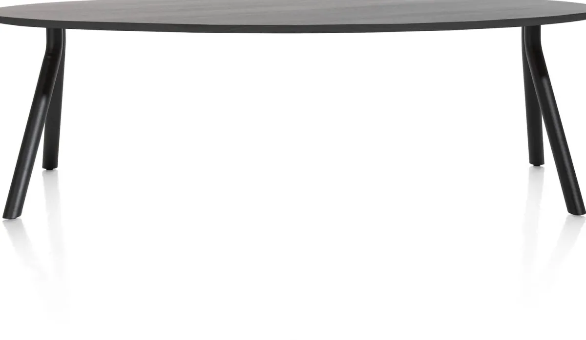 Geef je eethoek een totaal andere uitstraling met deze ellips vormige eettafel ARVADA van 220 x 110 cm. Heerlijk om lekker lang te tafelen met het gezin! Deze variant heeft ronde zwart metalen poten aan de zijkant, maar je kunt ook kiezen voor 1 centrale poot. Ga je voor dit massief eikenhouten blad in de kleur onyx of kies je voor de naturelkleur? Wij wensen je veel plezier met het samenstellen van jouw eettafel!