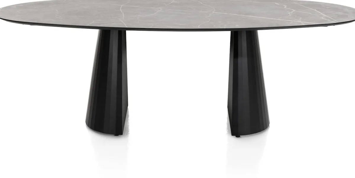 Is het geen plaatje; deze ellipsvormige eetkamertafel ARABAX uit de collectie van XOOON? ARABAX is een moderne ellipsvormige tafel, geïnspireerd op klassieke vormen en materialen. Het kegelvormige onderstel geeft deze eetkamertafel een unieke retro vintage look. ARABAX heeft een afmeting van 240 x 120 cm. De tafel heeft een HPL marmerlook blad dat naast deze mooie lichtgrijze tint ook verkrijgbaar is in de donkere kleur onyx. Kies zelf welke uitvoering het beste bij jou en je interieur past!