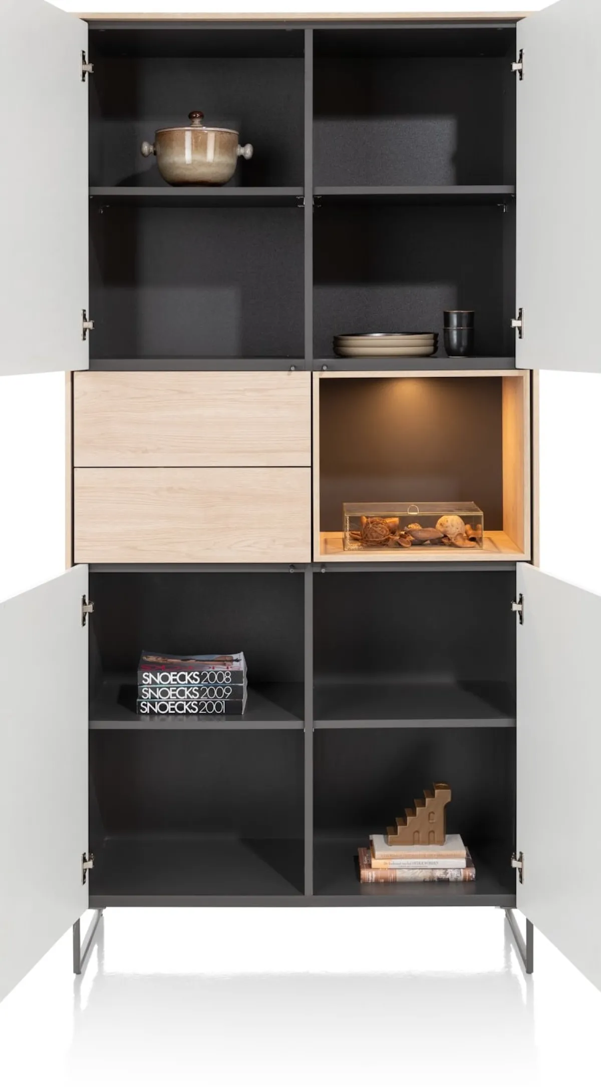 Opbergruimte genoeg in deze bergkast uit de LINDFIELD collectie! Ben je gek op minimalistisch design in je interieur en heb je vooral heel veel spullen?! Laat je verrassen door LINDFIELD! Deze greeploze bergkast is maar liefst 205 cm hoog en 100 cm breed. Hij heeft 4 deuren, 2 laden en 1 niche die met led is verlicht. LINDFIELD heeft witte fronten, afgewisseld met eikenlook elementen voor een natuurlijke touch. Het ranke onderstel van metaal maakt LINDFIELD helemaal af.