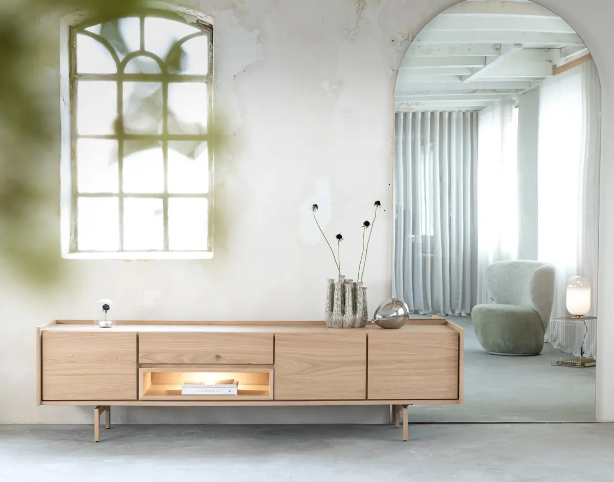 VALGARD is een strak vormgegeven lowboard met een natuurlijke look. Het is gemaakt van naturelkleur eikenfineer en staat op een onderstel in naturelkleur hout. Lowboard VALGARD heeft een afmeting van 190 cm en beschikt over 3-deuren en 1-lade met soft close systeem + 1-niche dat met led is verlicht. Het lowboard is greeploos, wat hem die strakke, minimalistische look geeft. Vergeet vooral niet te kijken naar de andere prachtige kasten uit deze serie. VALGARD is geweldig te combineren met bijpassende tafelcollecties: COSENZA en PALMA.