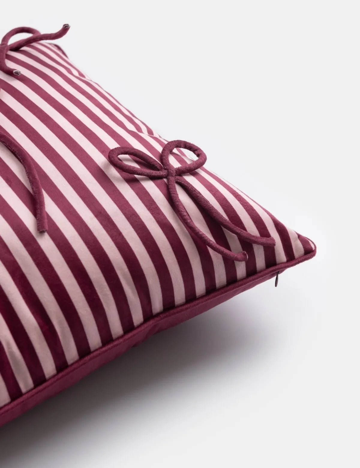 Het leuke Bow kussen is een cadeautje voor je interieur: kijk maar naar de vrolijke strikken! Het is gemaakt van een licht glanzende polyester streepstof in de kleuren roze en bordeauxrood, twee kleuren die helemaal trendy zijn in zowel kleding als interieur. Met een afmeting van 43x43cm past het leuk los in een fauteuil. Zeker tegen een naturel achtergrond steekt het mooi af. Maar je kunt het natuurlijk ook uitstekend combineren met andere sierkussens uit de COCOmaison collectie. Die hebben we namelijk in alle kleuren en maten!