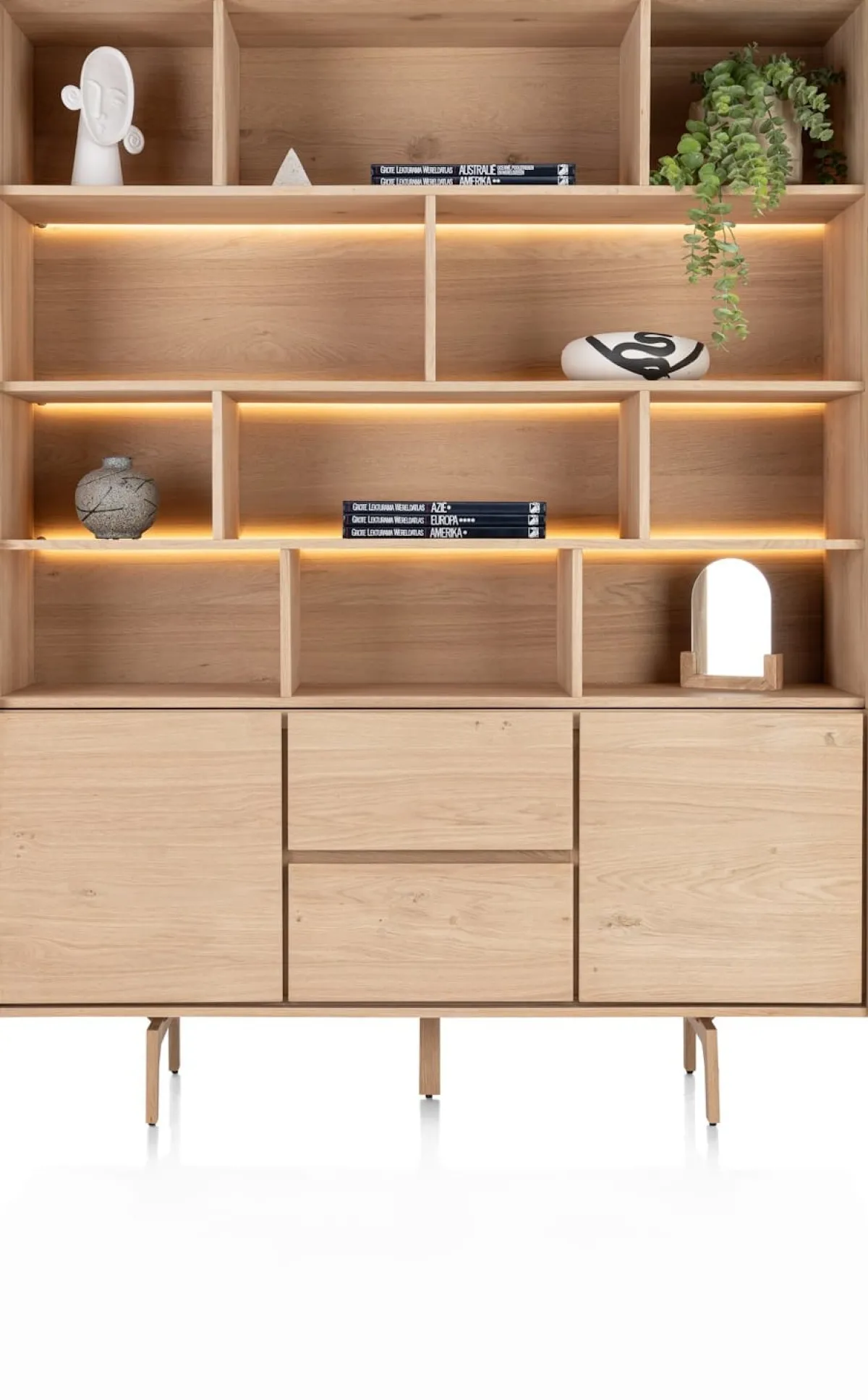 Droom je van een strak vormgegeven buffetkast met een natuurlijke uitstraling? Kijk dan eens naar VALGARD, een buffetkast, gemaakt van naturelkleur eikenfineer met een onderstel in naturelkleur hout. Hij heeft een breedte van 160 cm en is voorzien van 2-deuren en 2-laden. In de 11 met led verlichte niches zet je je mooiste items in de spotlights. VALGARD is greeploos en heeft een soft close systeem. Kijk ook eens naar de andere kasten uit deze serie. VALGARD is prachtig in combinatie met bijpassende tafelcollecties: PALMA en COSENZA.