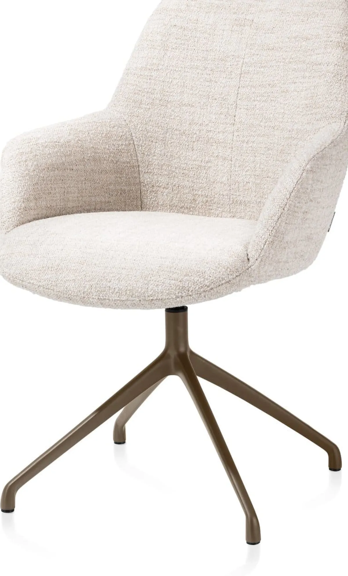 Wil je jouw interieur upgraden met een moderne armstoel? Ontdek armstoel MATS in de crèmekleurige stof Luton. MATS is populair vanwege zijn zachte, vriendelijke vormgeving. Ook is hij lekker praktisch dankzij het 360° draaibare steelbrown frame van aluminium. Ben je dol op lang tafelen? Dankzij de comfortabele armleuningen en heerlijke zit, ben je uren zoet met MATS. Ontdek de verschillende uitvoeringen waarin hij verkrijgbaar is qua kleur, bekleding en onderstel.