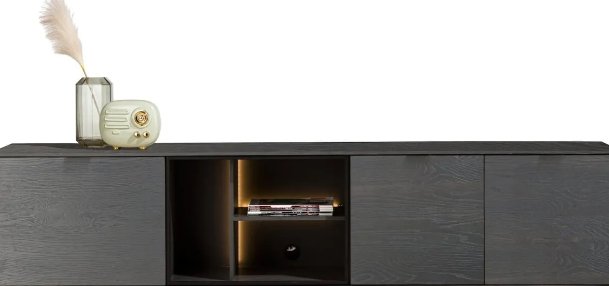 Met onze nieuwe serie ELEMENTS haal je de interieurstylist in je naar boven! Je stelt namelijk met alle losse ELEMENTS items jouw (wand)kast helemaal naar eigen wens samen. Gebruik dit onyx kleur lowboard van 210 cm breed inclusief 2 deuren, klep en 3 met led verlichte niches als basis en combineer het met andere ELEMENTS items in bijvoorbeeld naturel eiken fineer, lak groen, of lak zwart. Dit lowboard kan worden opgehangen aan de wand. Ga je voor een XS opstelling of pak je groots uit en wordt het een XXL kast?