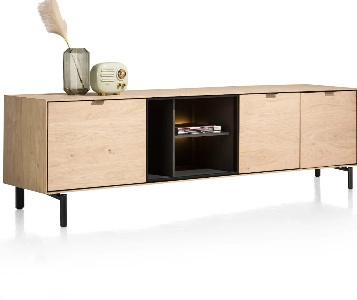 Clearance XOOON Elements, lowboard 210 cm. – hang + 2-deuren + klep + 3-niches + led incl. metalen poten – natural