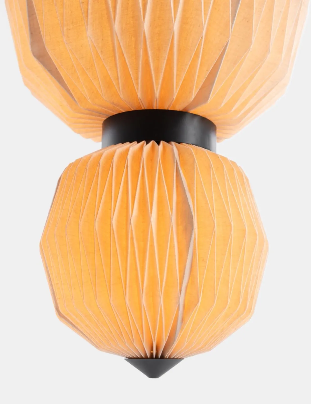 COCOmaison is dol op verrassende ontwerpen en dat zie je zeker terug in de Rikke hanglamp. Hij bestaat uit 2 bollen, een grote en een wat kleinere. Beide zijn gemaakt van stevig papier dat als smockwerk gevouwen is. Daarmee krijgt de lamp een origami-achtige uitstraling die helemaal past in de Japandi woonstijl. De hoogte is 77cm en de doorsnede 40cm, maar het is vooral het materiaal dat opvalt. Het papier heeft een naturel kleur en is semi-transparant, zodat de lamp een prachtig gedempt warm licht verspreidt als hij aan is. Maar ook als hij overdag uit is, is het een opvallend design object in huis. De hanglamp bestaat ook in een net iets andere uitvoering die je onderling mooi kunt combineren boven een wat grotere tafel.