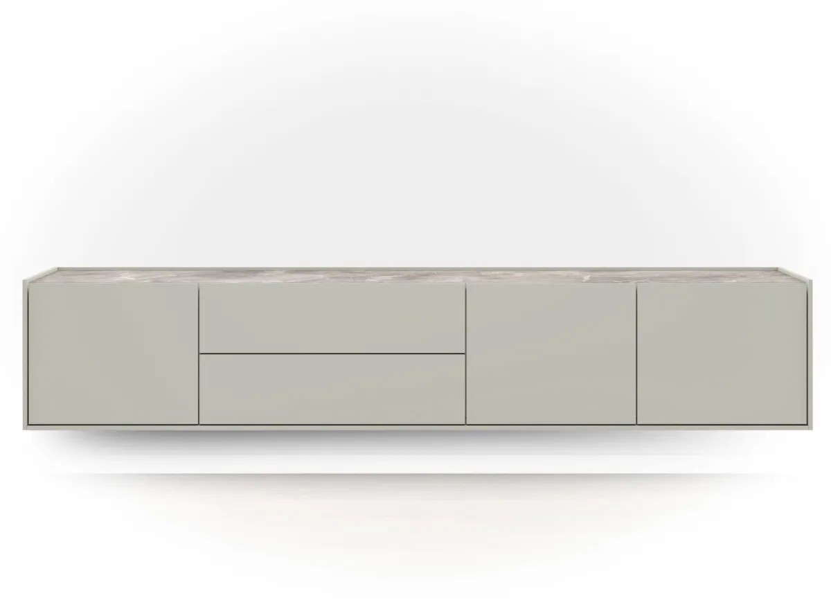 Ben je op zoek naar een lowboard met een strakke en elegante look? Dit is NOON: een stijlvol lowboard, gemaakt van gelakt MDF in de kleur silk grey. Het heeft een afmeting van 210 cm en is naar wens ook verkrijgbaar met een top in Primo Laminato (HPL) met marmerlook. Dit lowboard is greeploos en beschikt over 3 deuren + 2 laden, voorzien van een softclose systeem. Het staat op metalen pootjes, die in 2 kleuren verkrijgbaar zijn: grafiet (standaard) of silk grey (meerprijs). NOON heeft een moderne en toch tijdloze uitstraling waardoor hij in veel woonruimtes mooi staat. Het lowboard is er ook in een maat kleiner. Kijk ook eens naar de dressette, het dressoir en de bergkast uit deze serie.