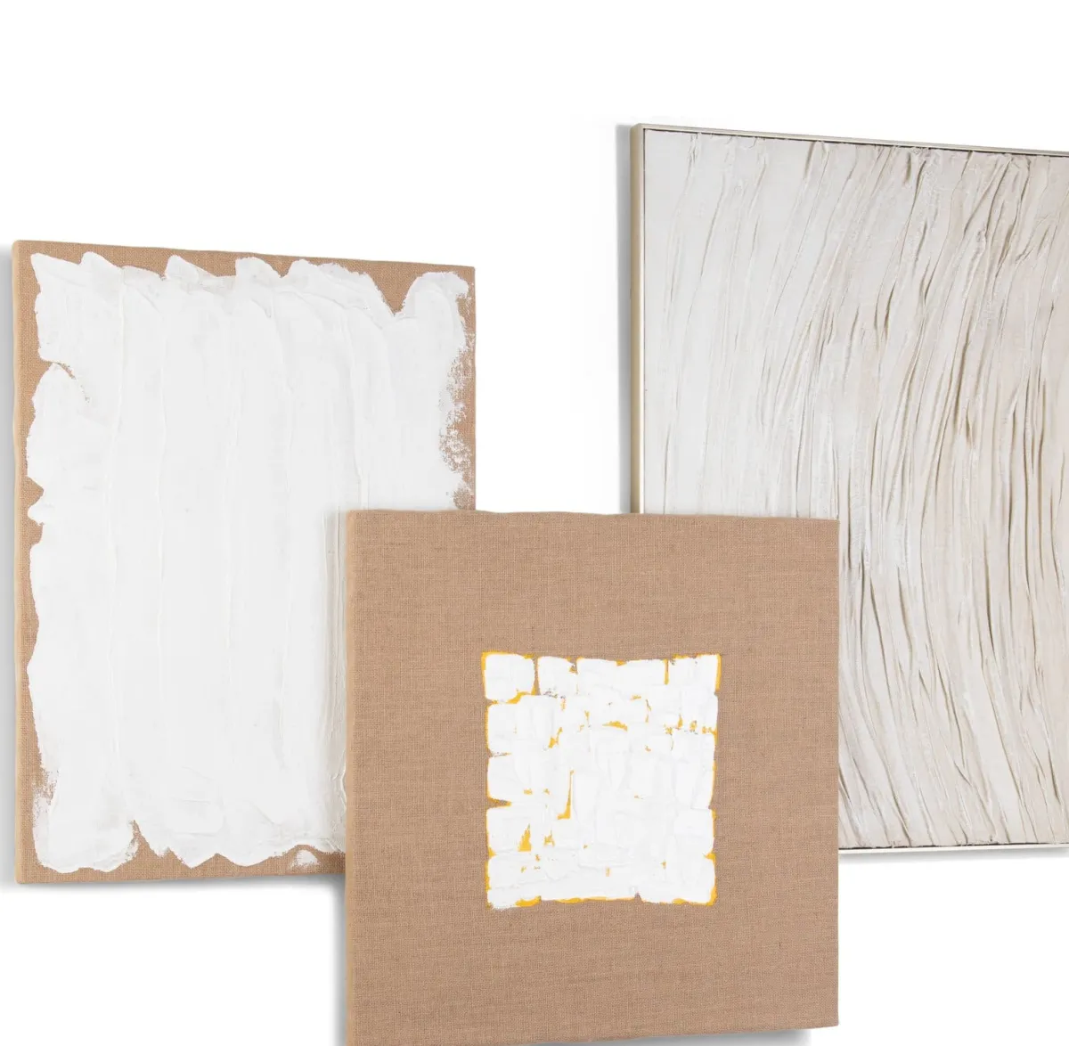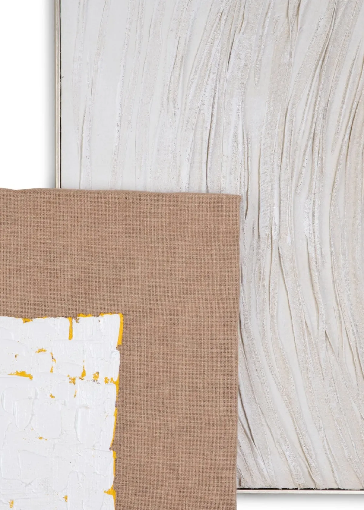 3D wanddecoratie is al een tijdje trendy in woonstyling. En zo lang er zulke fraaie schilderijen in de collectie zitten als de FINN van COCOmaison zal dat ook nog wel even blijven. FINN is vierkant en heeft een afmeting van 70x70cm. Het schilderij zonder frame bestaat uit een jute canvas met een dikke laag witte verf en een geel detail. Het materiaal en de afwerking geven deze wanddecoratie een hele pure, rauwe uitstraling. Houd je van deze stijl, combineer FINN dan met de schilderiijen BO en LIV.
