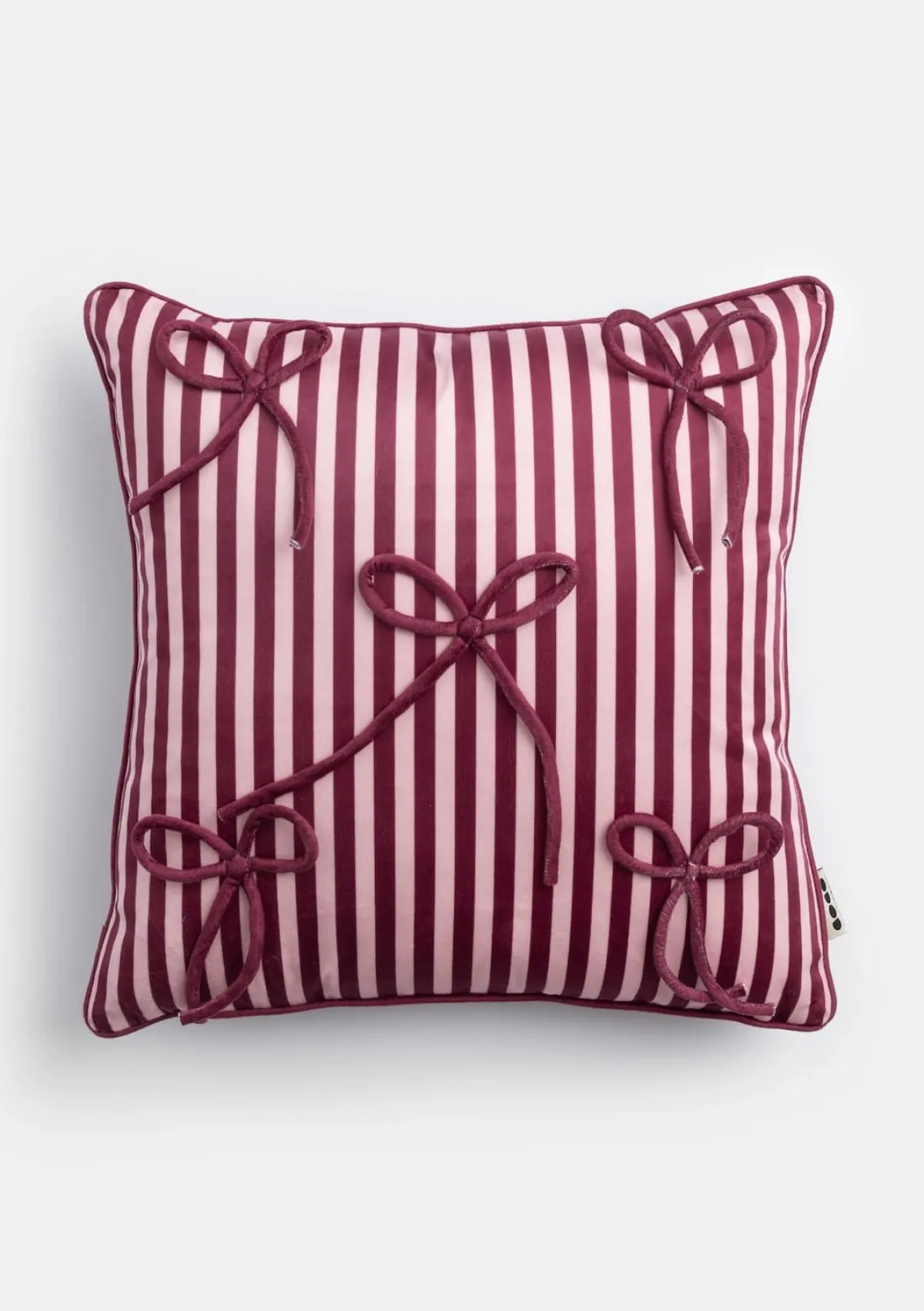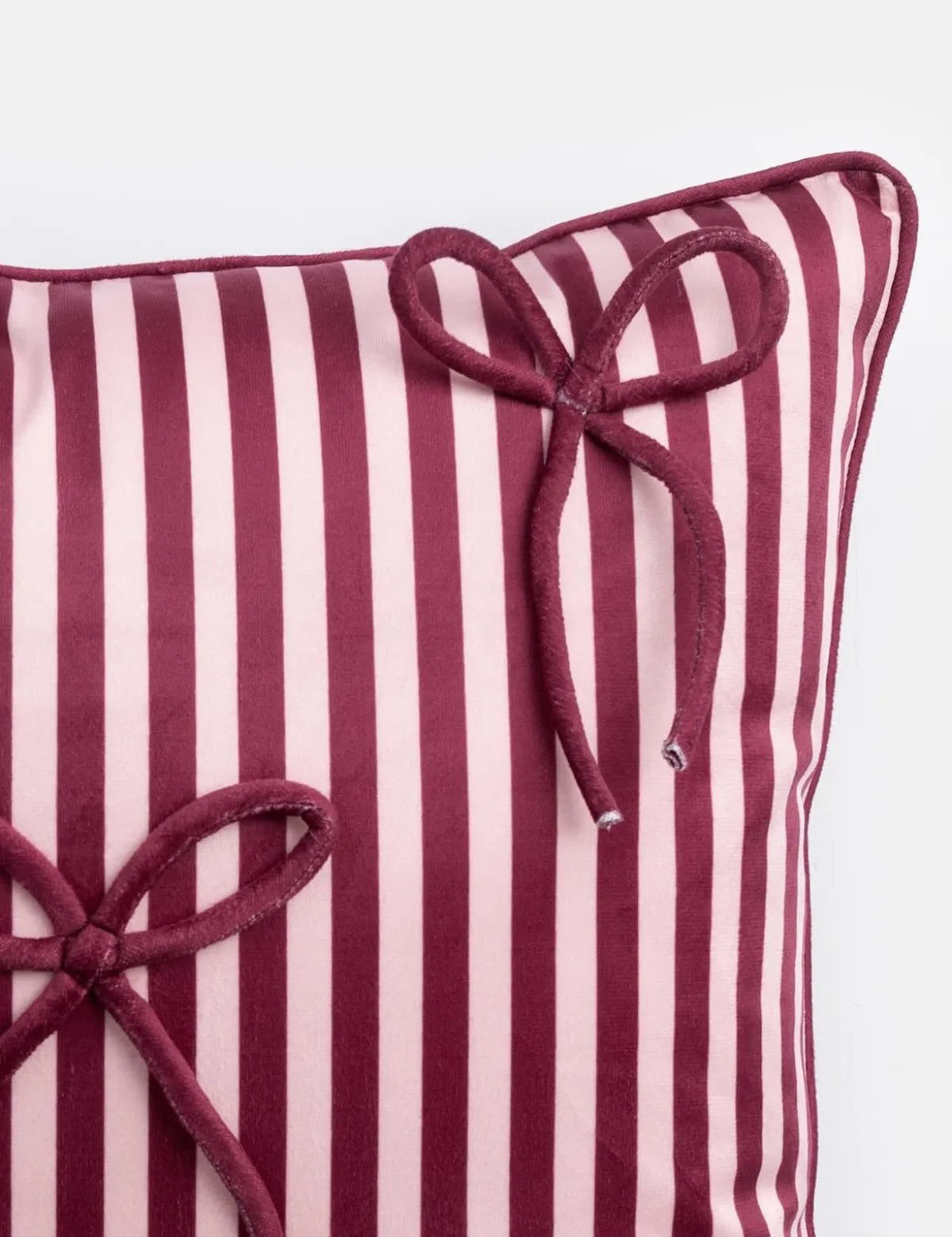 Het leuke Bow kussen is een cadeautje voor je interieur: kijk maar naar de vrolijke strikken! Het is gemaakt van een licht glanzende polyester streepstof in de kleuren roze en bordeauxrood, twee kleuren die helemaal trendy zijn in zowel kleding als interieur. Met een afmeting van 43x43cm past het leuk los in een fauteuil. Zeker tegen een naturel achtergrond steekt het mooi af. Maar je kunt het natuurlijk ook uitstekend combineren met andere sierkussens uit de COCOmaison collectie. Die hebben we namelijk in alle kleuren en maten!