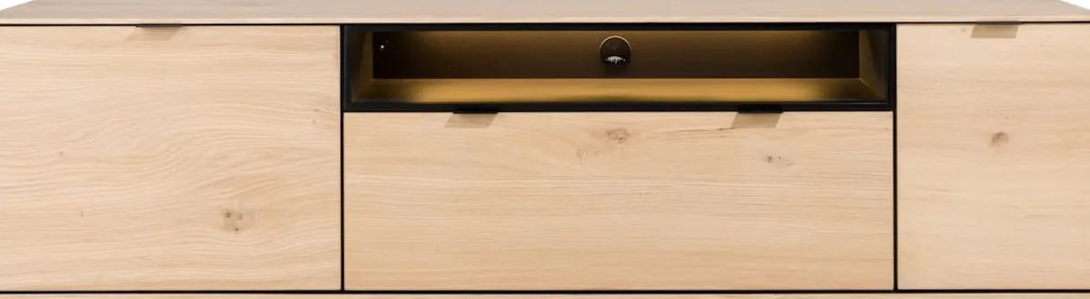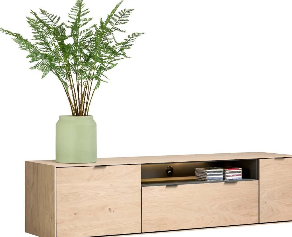 Met onze nieuwe serie ELEMENTS haal je de interieurstylist in je naar boven! Je stelt namelijk met alle losse ELEMENTS items jouw (wand)kast helemaal naar eigen wens samen. Gebruik dit naturel eiken fineer lowboard van 180 cm breed inclusief 1 deur, 1 lade + klep en 1 met led verlichte niche als basis en combineer het met andere ELEMENTS items in bijvoorbeeld onyx, lak groen, of lak zwart. Dit lowboard kan worden opgehangen aan de wand. Ga je voor een XS opstelling of pak je groots uit en wordt het een XXL kast?