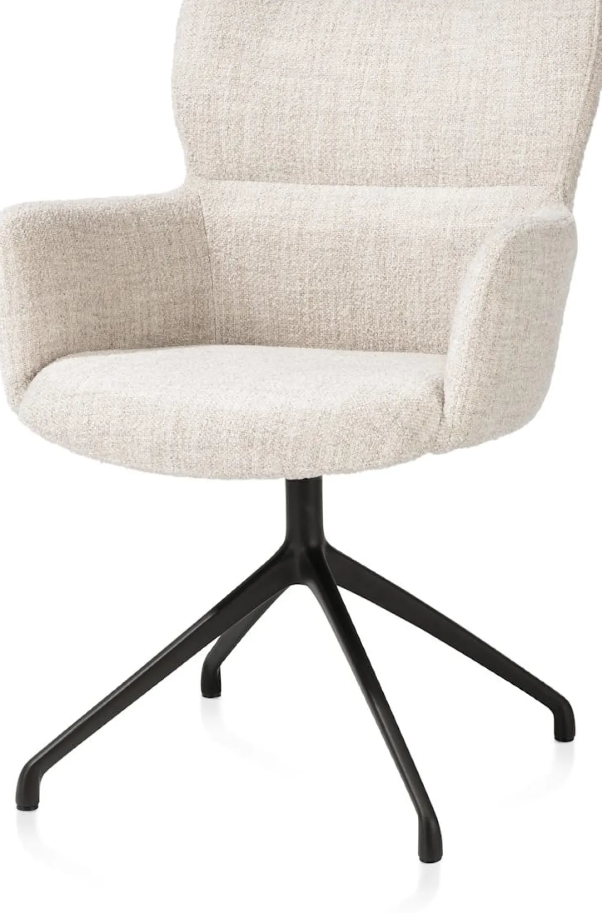 Armstoel SAGE in crèmekleur combineert zachte elegantie met praktisch comfort. De stoel is bekleed met stof Luton, een bouclé-achtige meubelstof met een aangenaam zachte, aaibare structuur. Het draaibare onderstel in rough off black voegt gebruiksgemak toe en maakt deze armstoel ideaal voor lange, ontspannen diners.