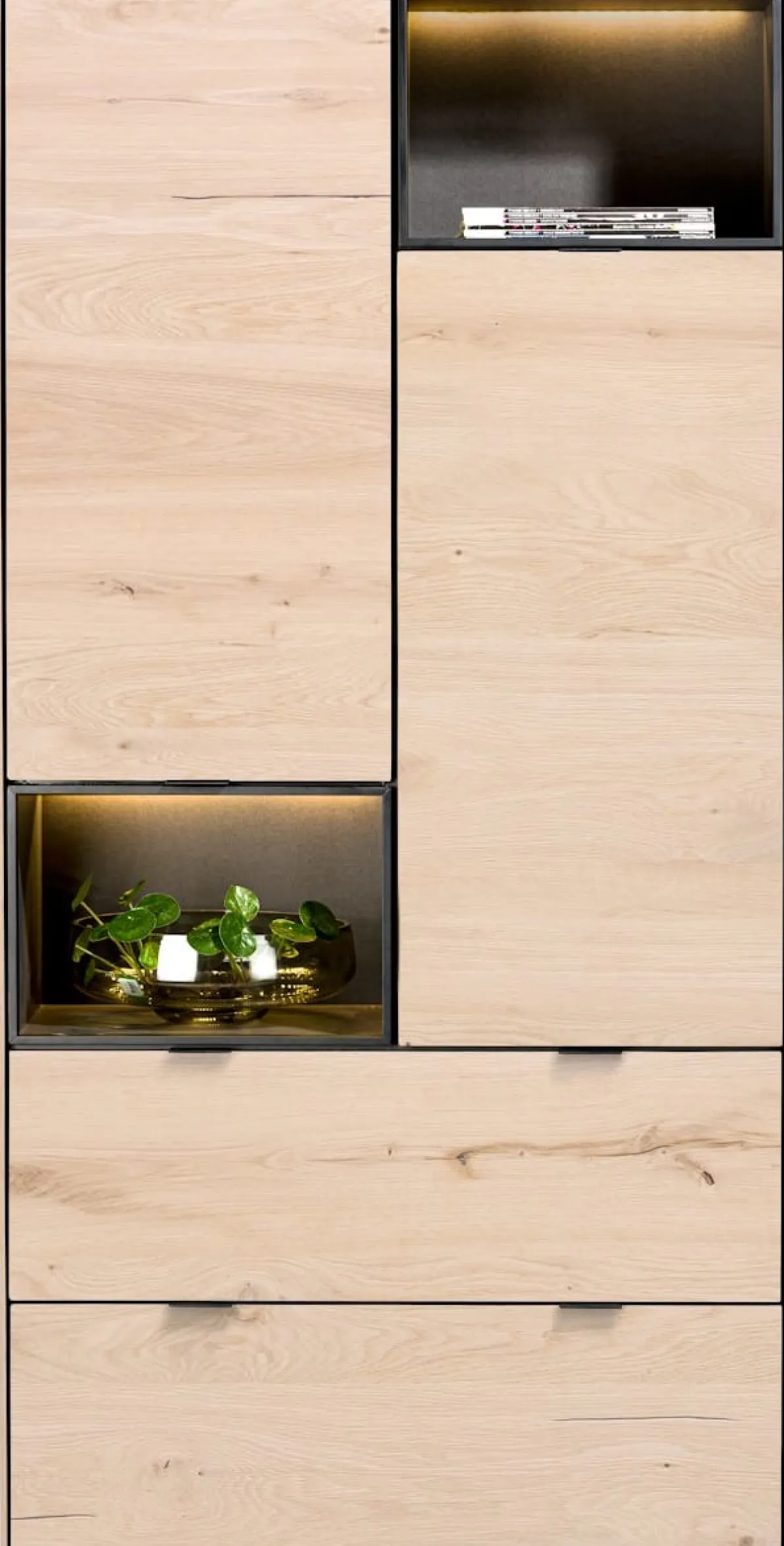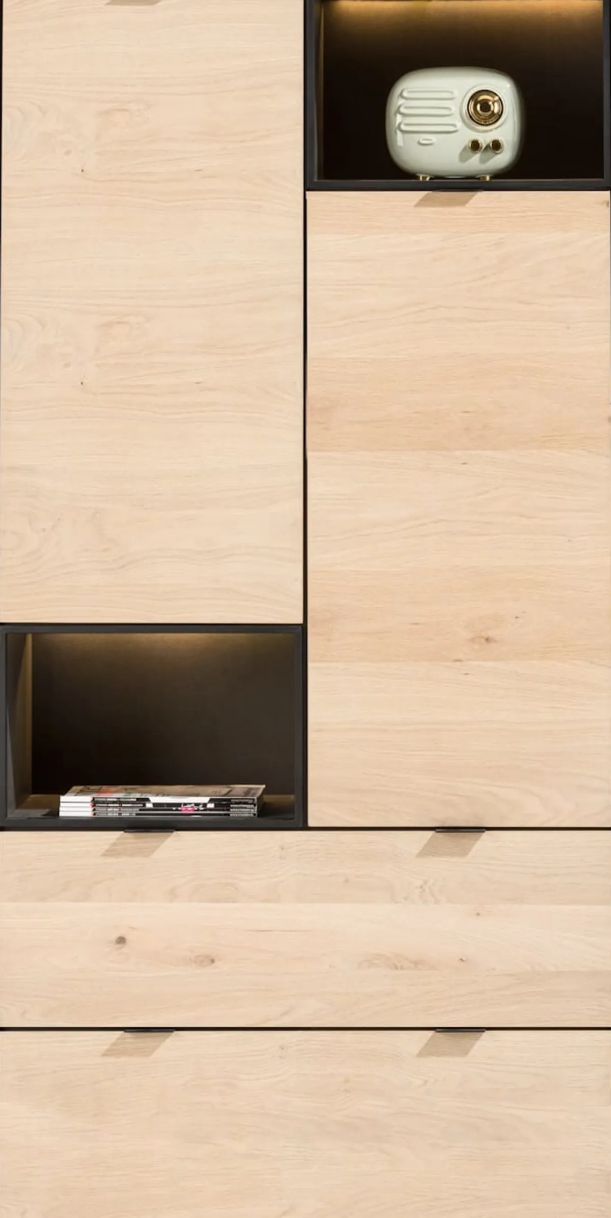Met onze nieuwe serie ELEMENTS komt de interieurstylist in jou naar boven! Je kunt namelijk met alle losse ELEMENTS items jouw (wand)kast helemaal naar eigen wens samenstellen. Combineer deze naturel bergkast van 90 cm met 2 deuren, 2 laden + 2 met LED verlichte niches samen met andere ELEMENTS in bijvoorbeeld onyx eiken fineer of lak groen of zwart, en style er lekker op los! De lades in dit element bevatten een subtiel zwart handgreepje. Ga je voor een XS opstelling of pak je groots uit en wordt het een XXL kast?