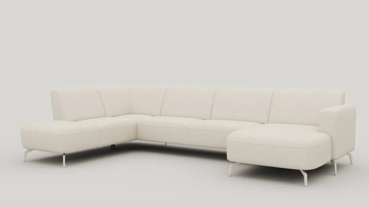 Deze TWIST-opstelling straalt warmte en elegantie uit. De combinatie van een longchair (chaise longue) links, een 2,5-zits zonder armen en een ottomane (ligelement) rechts vormt een ruime, comfortabele U-opstelling. De bank is bekleed in boucléstof Brioni in de kleur lever en rust op metalen designpoten in de trendy kleur silk grey. Met zijn afgeronde lijnen en zachte zit door de standaard pocketvering, past hij perfect in een modern interieur. Deze opstelling is ook leverbaar in crème, ivory en kiezel.