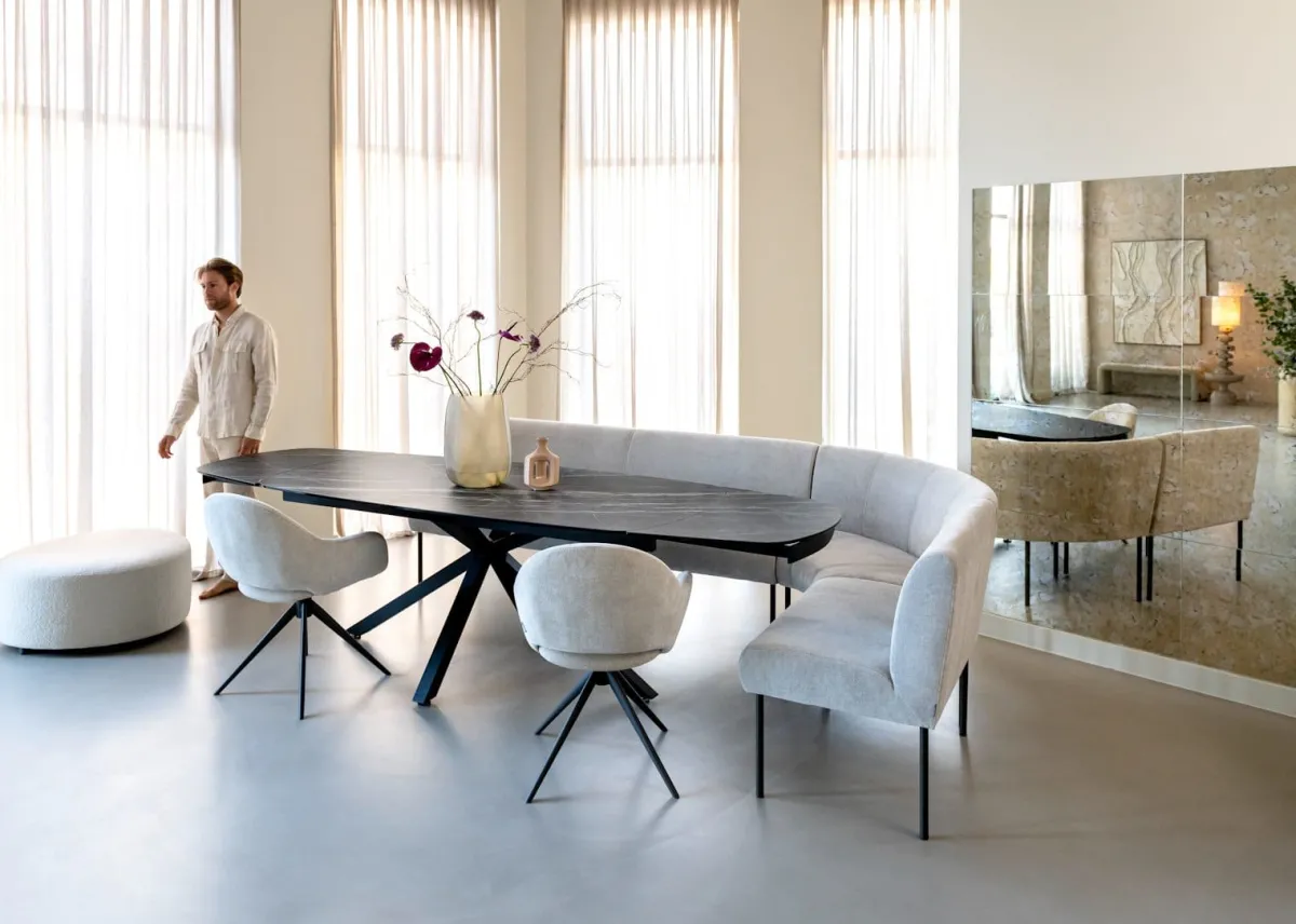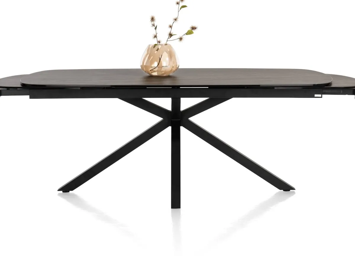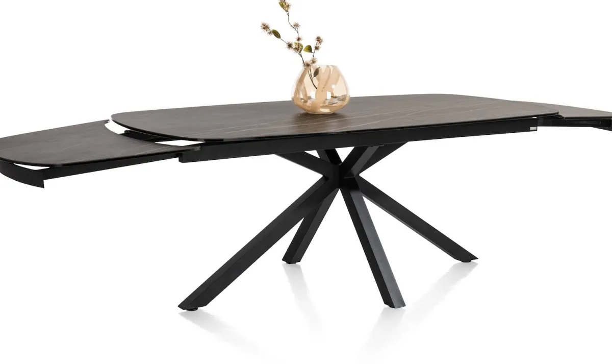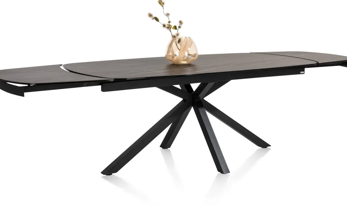 Ben je op zoek naar een ovale uitschuiftafel? Met eetkamertafel MONTELLO ben je altijd voorbereid op onverwachte eters. Het prachtige zwarte marmeren blad van keramiek op glas is met 50 cm aan weerszijden uit te schuiven tot 300 cm en is er ook in de kleurwit. De opvallende zwart metalen poot geeft de tafel een extra chique look.