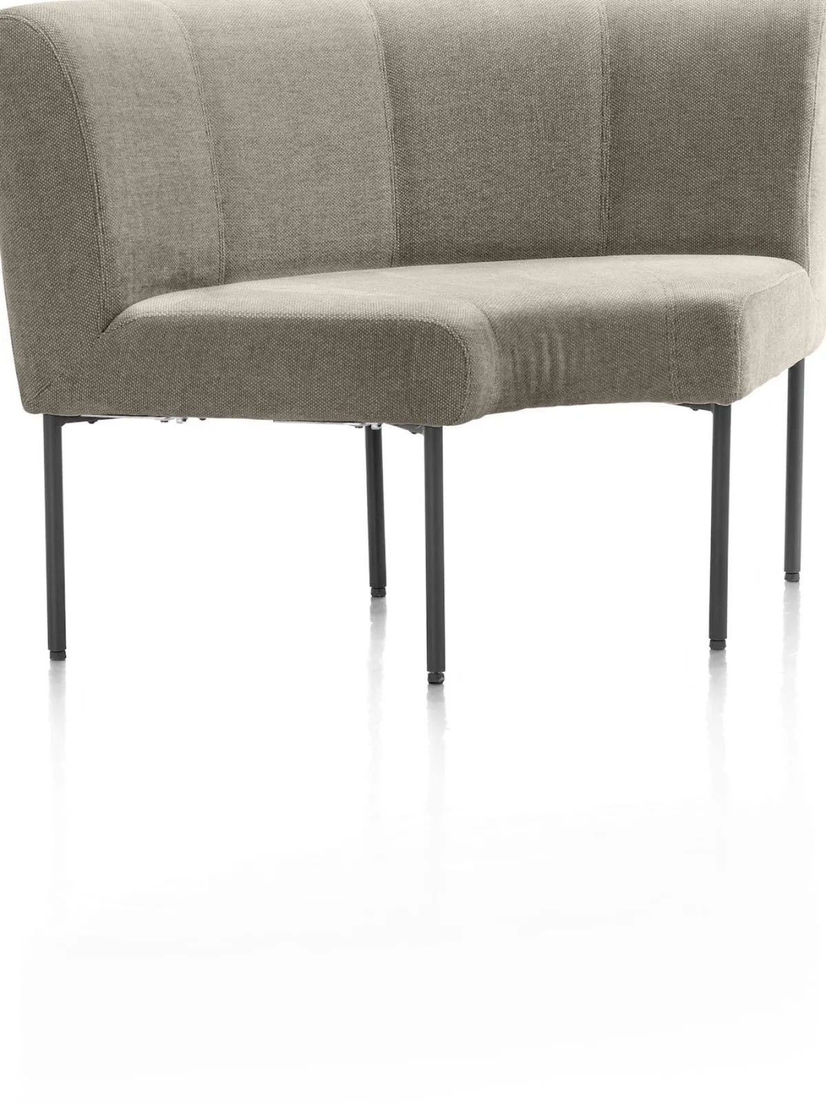 Verleng jouw REVERSO eetkamerbank met deze afgeronde hoek waardoor hij nog meer plek biedt aan je eetkamertafel. Je personaliseert jouw REVERSO zowel qua opstelling geheel naar eigen wens. Deze hoek REVERSO is koppelbaar en uit te breiden met de andere elementen uit deze serie. De prachtige chenillestof Livigno in bruin komt in elk interieur mooi tot zijn recht. Het ranke onderstel is gemaakt van metaal in de kleur grafiet. Eetkamerbank REVERSO is rondom gestoffeerd en daardoor ook erg mooi vrij in de ruimte te plaatsen.