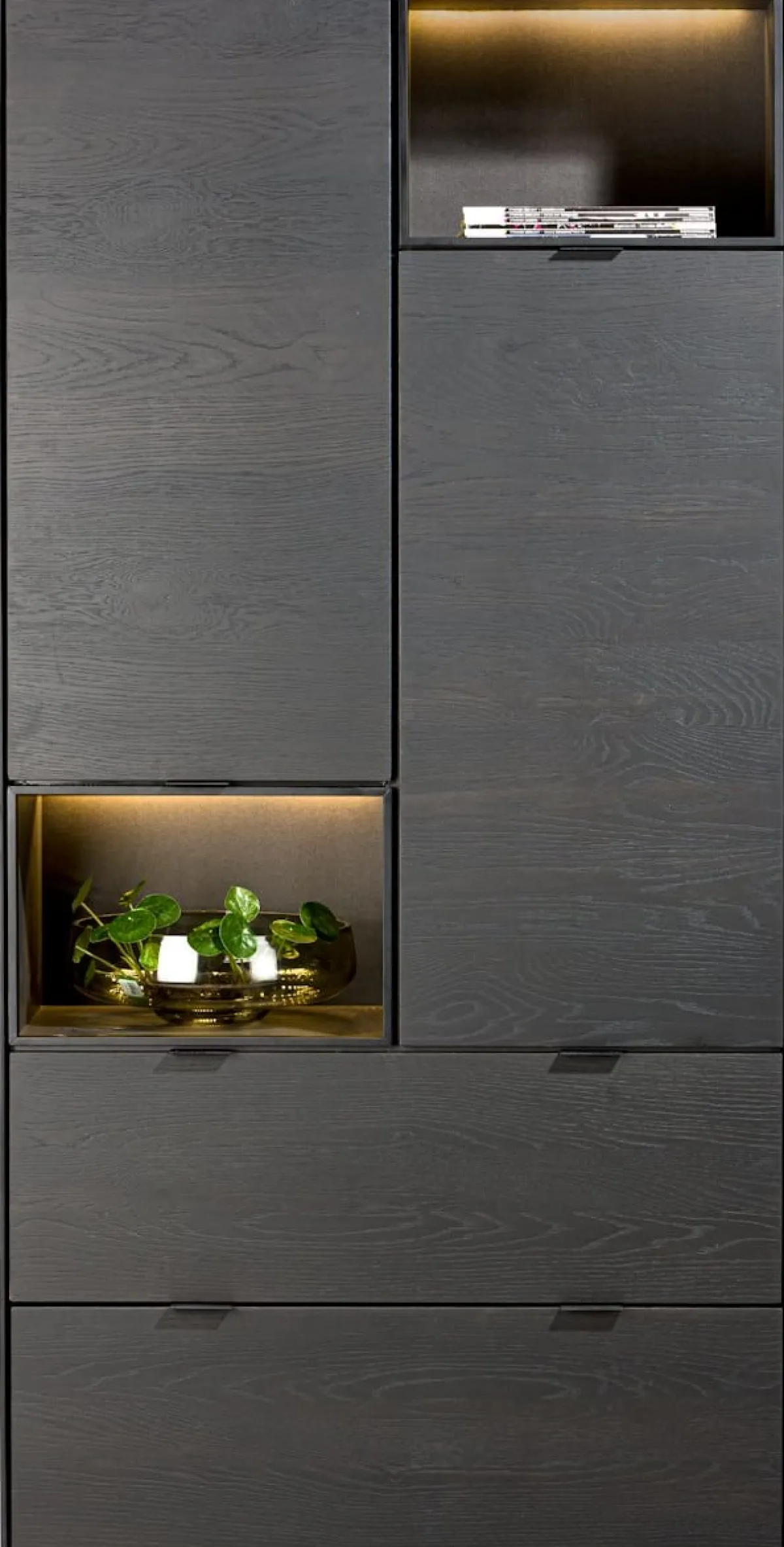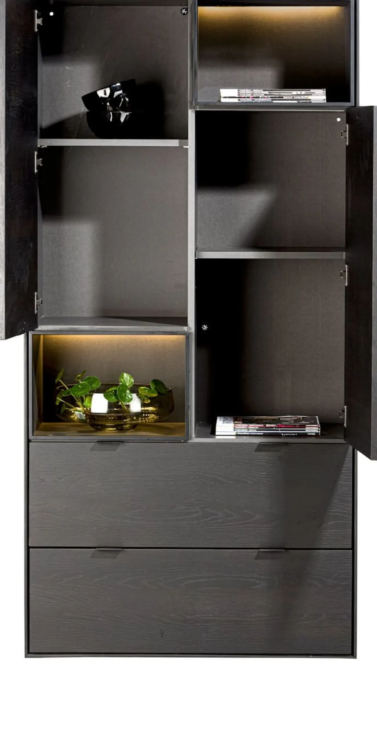 Met onze nieuwe serie ELEMENTS haal je de interieurstylist in je naar boven! Je stelt namelijk met alle losse ELEMENTS items jouw (wand)kast helemaal naar eigen wens samen. Gebruik deze onyx kleur bergkast van 90 cm breed voorzien van 2 deuren, 2 laden en 2 met led verlichte niches als basis en combineer hem met andere ELEMENTS items in bijvoorbeeld naturel eiken fineer, lak groen, of lak zwart. Ga je voor een XS opstelling of pak je groots uit en wordt het een XXL kast? Tip: perfect te combineren met highboard ELEMENTS!