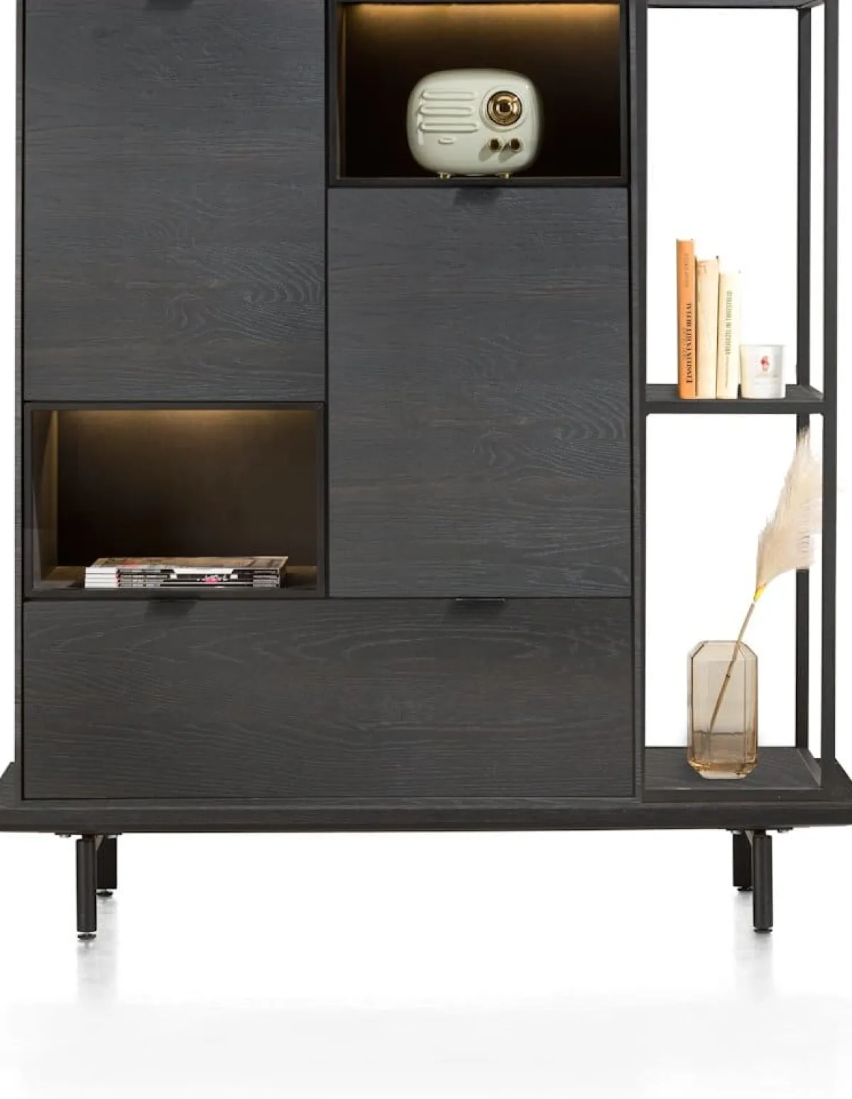 Met onze nieuwe serie ELEMENTS haal je de interieurstylist in je naar boven! Je stelt namelijk met alle losse ELEMENTS items jouw (wand)kast helemaal naar eigen wens samen. Gebruik deze onyx kleur boekenkast van 120 cm hoog voorzien van 2 niches met zwart metalen frame en combineer hem met andere ELEMENTS items in bijvoorbeeld naturel eiken fineer, lak groen, of lak zwart. Ga je voor een XS opstelling of pak je groots uit en wordt het een XXL kast?